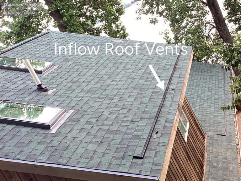 💡 Lyle’s Pro Tip Always ask your roofing contractor about proper ventilation – that means intake of air and outflow of air. In most cases, inflow will occur through soffit ventilation, although we also use inflow vents on the roof occasionally. To allow air to escape, vents typically include ridge vents, box vents, or attic vents. They are higher to allow warm air to rise and leave the space.