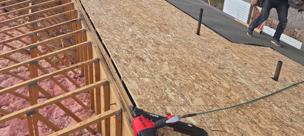 Older town homes often have 1” plank board sheeting, which had to be installed with 1” gaps for the old cedar shake shingles. If we tear those off, we have to replace the whole roof deck with new OSB sheeting per code-required thickness or fill in the 1” gaps between the plank boards to bring it up to code and manufacturer specifications.